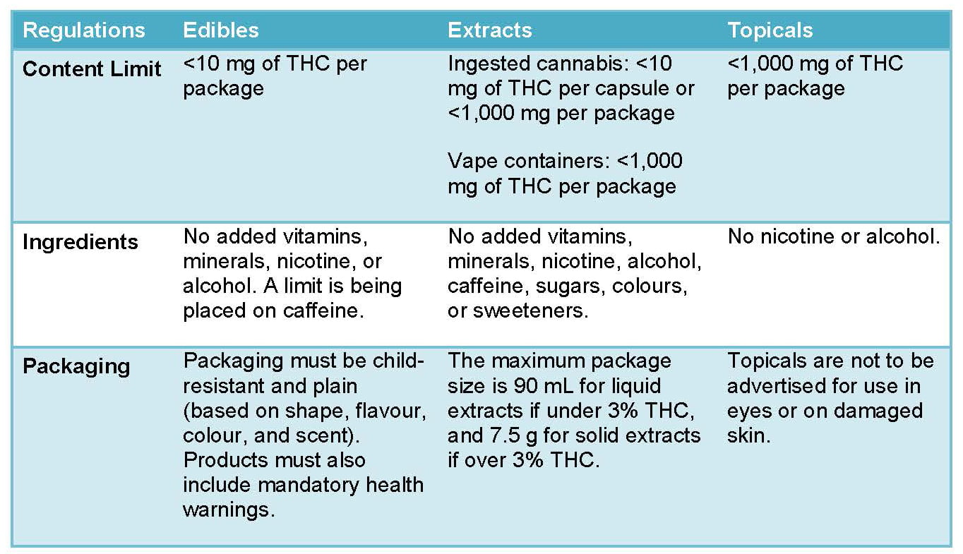 The chart below summarizes some of the regulations surrounding packaging and dosage for these derivative cannabis products:[13]