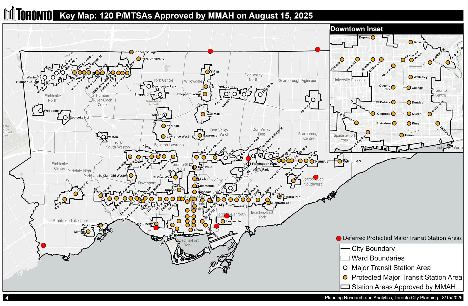 Figure 1 – City of Toronto map, as modified by WeirFoulds LLP, showing the MTSAs and PMTSAs approved by the Minister, and those deferred. Note some deferred stations in the City’s east end are not shown due to the City’s inset map.